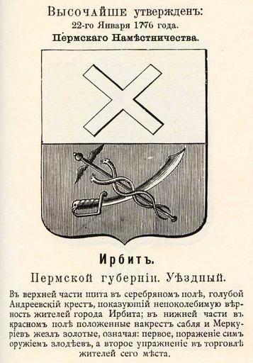 | Keywords: Ирбит 1776 из Винклера.jpg Official Russian Empire Irbit coat of arms Ге б уездного го ода И бит Пе мской губе нии Российской Импе ии с официальным описанием в Ге бовнике Павла Пет овича Винкле а П П фон-Винкле Ге бы го одов губе ний областей и посадов Российской Импе ии внесенные в Полное Соб ание законов с 1649 по 1900 год Дозволено цензу ою С -Пете бу г 20 Июля 1899 года Издание книгото говца Ив Ив Иванова С -Пете бу г Типог афия И Комелова П яжка д 3 1899 / Scanned 1776 / 1899 published П П фон Винкле / Pavel von Vinkler PD-old PD-RusEmpire PD-RU-exempt coats of arms Gerbovnik Vinklera - City CoAs Coats of arms of Perm Governorate Crosses in heraldry Sabres in heraldry Snakes in heraldry |