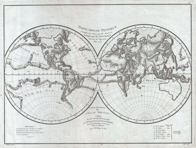 | Keywords: 1779 Pallas and Mentelle Map of the Physical World - Geographicus - World-mentelle-1779.jpg This is a highly unusual 1779 map of the world exhibiting a very peculiar physical topography that reveals mountain ranges both on land and under the sea The curious undersea mountain ranges displayed here was drawn by Abbe Mongez to illustrate the geographical theories of Peter Simon Pallas a German polymath living in Russia who speculated that mountain ranges originated from a series of interterrestial explosions volcanoes many of which are noted on the map as asterisks Aside from Pallas ™s unusual marine topography this map follows many of the speculative cartographic conventions of the late 18th century These include the presence of a large inland sea in the western part of North America a series of navigable channels in modern day Canada harkening to the mythical Admiral De Fonte ™s journals and a mountainous Nile source in Africa Van Diemen ™s Land or Tasmania is attached to the mainland of Australia A southern continent is only tenuously suggested by two speculative landmasses shown in the southern Indian Ocean and just south of Tierra del Fuego This map was first drawn by Abbe Mongez then engraved by Ambrose Tardieu for inclusion as title plate number 0 or folio 1 in Mentelle ™s 1779 Atlas Universel A curious side note The Abbe Mongez who drew this map was the geologist and naturalist on La Perouse ™s ill-fated expedition to the Pacific The Perouse expedition shipwrecked in 1788 on the island of Vanikoro and after living on the island for a short time vanished entirely Recently the remains of the Perouse wreckage including a mysterious skull were discovered on the Vanikoro reefs Forensic scientists have reconstructed the facial features of the skull which many believe to be none other than the Abbe Mongez 1779 dated Size in 17 13 object history credit line accession number World-mentelle-1779 Mentelle E <i>Atlas Universel<i/> Paris 1779 Geographicus-source PD-Art-100 Maps by Edme Mentelle 1779 maps Old maps of Earth's hemispheres Jean-André Mongez Peter Simon Pallas Maps in French Maps of mountains Seamounts Submarine volcanoes Maps of submarine volcanoes |