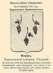 | Keywords: Хар губ Изюм 1781 из Винклера.jpg Official Russian Empire coat of arms Izum Т н гласный ге б изюм Российской Импе ии уездного го ода Изюм Ха ьковской губе нии с официальным описанием в Ге бовнике Винкле а П П фон-Винкле Ге бы го одов губе ний областей и посадов Российской Импе ии внесенные в Полное Соб ание законов с 1649 по 1900 год Дозволено цензу ою С -Пете бу г 20 Июля 1899 года Издание книгото говца Ив Ив Иванова С -Пете бу г Типог афия И Комелова П яжка д 3 1899 \ Scanned paper book 1775 Ге бовник Ще батова /1781 утве ждён / 1899 published П П фон Винкле \ Pavel von Vinkler PD-old PD-RusEmpire PD-RU-exempt coats of arms Gerbovnik Vinklera - City CoAs Изюm Coats of arms of Izium 1781 in Kharkov Governorate Russian canting arms |