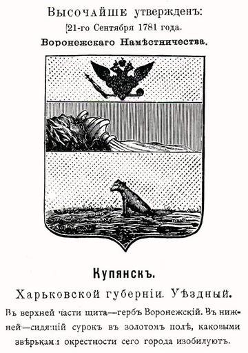 | Keywords: Хар губ Купянск 1781 из Винклера.jpg  Official Russian Empire coat of arms Kupiansk Ге б Российской Импе ии уездного го ода Купянск в 1899 Ха ьковской губе нии в 1781 - Во онежского наместничества с официальным описанием в Ге бовнике Винкле а П П фон-Винкле Ге бы го одов губе ний областей и посадов Российской Импе ии внесенные в Полное Соб ание законов с 1649 по 1900 год Дозволено цензу ою С -Пете бу г 20 Июля 1899 года Издание книгото говца Ив Ив Иванова С -Пете бу г Типог афия И  Комелова П яжка д 3 1899 \ Scanned by Vizu 1781 \ 1899 published П П фон Винкле \ Pavel von Vinkler PD-old PD-RusEmpire PD-RU-exempt coats of arms Gerbovnik Vinklera - City CoAs Kупянck Coats of arms of Voronezh Governorate Coats of arms of Kupiansk 1781 in Kharkov Governorate |