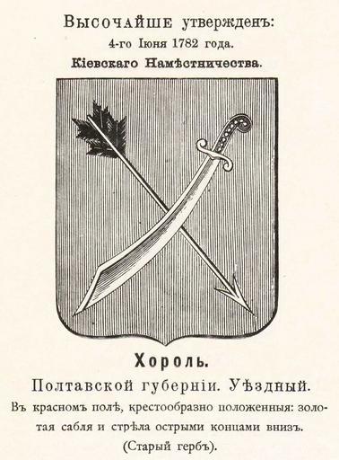| Keywords: Хороль 1782 из Винклера.jpg  Official Russian Empire coat of arms Horol Ге б Российской Импе ии уездного го ода Хо ол ь Киевского наместничества в 1782 Полтавской губе нии в 1899 с официальным описанием в Ге бовнике Винкле а П П фон-Винкле Ге бы го одов губе ний областей и посадов Российской Импе ии внесенные в Полное Соб ание законов с 1649 по 1900 год Дозволено цензу ою С -Пете бу г 20 Июля 1899 года Издание книгото говца Ив Ив Иванова С -Пете бу г Типог афия И  Комелова П яжка д 3 1899 \ Scanned 1782 \ 1899 published П П фон Винкле \ Pavel von Vinkler PD-old PD-RusEmpire PD-RU-exempt coats of arms Gerbovnik Vinklera - City CoAs Coats of arms of Poltava Governorate Swords in heraldry Khorol |