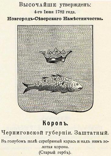 | Keywords: Короп 1782 из Винклера.jpg  Official Russian Empire coat of arms Korop Гласный ге б Российской Импе ии заштатного го ода Ко оп Че ниговской губе нии в 1782 -  овго од-Севе ского наместничества с официальным описанием в Ге бовнике Винкле а П П фон-Винкле Ге бы го одов губе ний областей и посадов Российской Импе ии внесенные в Полное Соб ание законов с 1649 по 1900 год Дозволено цензу ою С -Пете бу г 20 Июля 1899 года Издание книгото говца Ив Ив Иванова С -Пете бу г Типог афия И  Комелова П яжка д 3 1899 \ Scanned 1782 \ 1899 published П П фон Винкле \ Pavel von Vinkler PD-old PD-RusEmpire PD-RU-exempt coats of arms Gerbovnik Vinklera - City CoAs Coats of arms of Chernigov Governorate Russian canting arms Fish in heraldry |