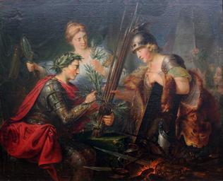 | Keywords: 1786 Rode Allegorie auf Friedrich den Großen anagoria.JPG Artwork Creator Bernhard Rode title Allegorie über Friedrich den Großen als Gründer des deutschen Fürstenbundes 1785 Allegory of Frederick the Great as Founder of the Alliance of German Princes 1785 1786 Oil on canvas Bode-Museum http //www bpk-images de/shop bpk-images de search 00028600<br>http //www spk-digital de/showDetail html id 22/bam/museum/smb/gg/00029272 22 Stiftung Preußischer Kulturbesitz Object history ProvenanceEvent 1923 acquisition Friedrich der Zweyte der mit einer Fackel die Waffen des Krieges angezündet hat umwindet mit dem friedlichen Oehlzweige den ihm die Staatsklugheit vorhält das Bund Wurfpfeile welches ihm von der Göttin Deutschlands dargereicht wird hinter dieser steht die Göttin der Eintracht die man an ihren beiden zusammengeschlungenen Fruchthörnern erkennt Katalog der Berliner Akademieausstellung des Jahres 1787 žDie Klugheit hält einen länglich runden metallenen Spiegel dessen Stiel mit einer Schlange dem Kennzeichen der Schlauigkeit umwunden ist In dem Spiegel sieht die Göttinn was hinter ihr ist so wie ein Kluger aus dem Vergangenen auf das Zukünftige schließt Karl Wilhelm Ramler Allegorische Personen zum Gebrauche der bildenden Künstler 1 Band 3 Stück Berlin 1788 Bode-Museum Accession number 1913 Other versions <gallery> Rode Allegorie Friedrich Fürstenbund 1786 jpg Allegorie auf Friedrich den Grossen jpg </gallery> PD-old-100 DEFAULTSORT Rode Allegory of Frederick the Great as Founder of the Alliance of German Princes 1780s paintings by Bernhard Rode Paintings in the Bode-Museum Friedrich II of Prussia in paintings Lion fur-skins in art Laurel wreaths Paintings by Bernhard Rode with fur People with fire in art People with helmets People with mirrors in art 18th-century allegorical paintings 18th-century oil on canvas paintings in Germany 18th-century profile portrait paintings 18th-century profile portrait paintings of women 18th-century profile portrait paintings of men 1786 paintings in Germany Files by User anagoria |