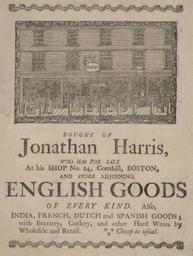 | Keywords: 1790 JonathanHarris Cornhill Boston.png Trade card Bought of Jonathan Harris who has for sale at his shop no 24 Cornhill Boston and store adjoining English goods of every kind American Broadsides and Ephemera Series 1 1790 Harris Cornhill Boston Massachusetts pre-1829 Boston in the 1790s Shops in Boston PD-old-100 |