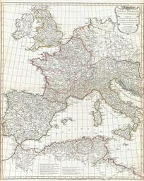 | Keywords: 1794 Anville Map of the Western Roman Empire (includes Italy) - Geographicus - RomanEmpireWest-anville-1794.jpg A large and dramatic J B B D'Anville map of the western part of the Roman Empire Covers from England Brittania and Ireland Hibernia south to Spain Hispania and Morocco Mauretania and east as far as Italy Italia and Dalmatia Includes the western part of the Mediterranean Sea and the Adriatic Details mountains rivers cities roadways and lakes with political divisions highlighted in outline color Decorative title cartouche bearing the Roman Eagle appears in the upper right Includes eight distance scales bottom center referencing various measurement systems common in antiquity Text in Latin and English Drawn by J B B D'Anville in 1764 and published in 1794 by Laurie and Whittle London dated 1763 published 1794 Size in 21 5 26 5 object history credit line accession number RomanEmpireWest-anville-1794 D'Anville J B B <i>Complete Body of Ancient Geography</i> Laurie and Whittle London 1795 Geographicus-source PD-old-100 Old maps of the Roman Empire Maps of the Western Roman Empire 1763 maps Maps in Latin |