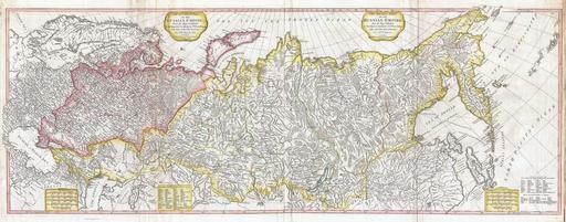 | Keywords: 1794 Laurie and Whittle Wall Map of Russia - Geographicus - Russia-lauriewhittle-1794.jpg An rare and magnificently proportioned 1794 wall map of the Russian Empire by Laurie and Whittle Extends from the North Sea and the Black Sea eastward as far as Siberia and the Behring Strait Extends south to China and the Aral Sea and north to include the island of Nova Zembla and the Arctic Color coded according to region with Russia in Europe toned in reds and pinks and Russia in Asia in yellows and greens This map is most interesting in its extreme eastern portions which when this map was drawn had only recently been explored The explorations of Vitus Behring are very much in evidence with regard to the form of Kamtschatka and the extreme northeast of Siberia Shows variosu nautical routes from Okotskoi Ostrog in Siberia ccross the Sea of Okotsk to Kamtschatka and the Kuril Islands Sakhalin is curiously divided into two separate islands Hokkaido appears as Matmay or Atkis Identifies Behring Island off the coast of Kamtschatka where the great Arctic navigator ultimately met his doom Published by Laurie and Whittle as plate no 25 in the 1797 edition of Thomas Kitchin's General Atlas 1794 dated Size in 51 19 object history credit line accession number Russia-lauriewhittle-1794 Kitchin Thomas <i>Kitchin's General Atlas describing the Whole Universe being a complete collection of the most approved maps extant; corrected with the greatest care and augmented from the last edition of D'Anville and Robert with many improvements by other eminent geographers engraved on Sixty-Two plates comprising Thirty Seven maps </i> Laurie Whittle London 1797 Geographicus-source PD-Art-100 Old maps of the Russian Empire 1794 maps Maps in English |
