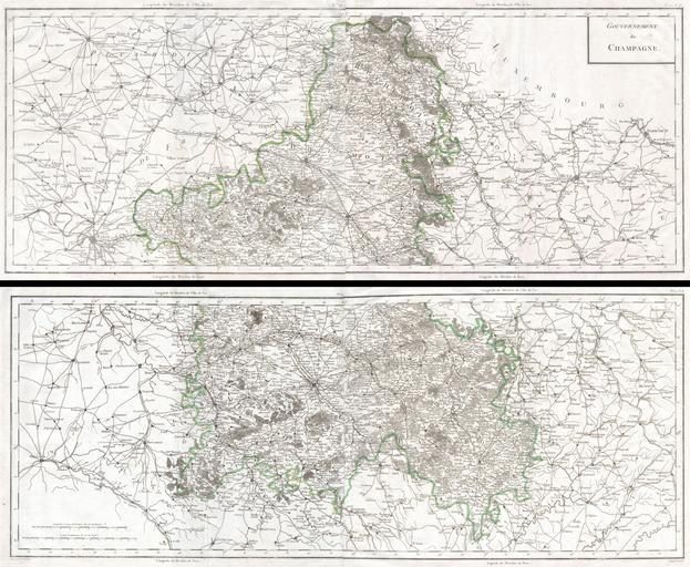 | Keywords: 1797 Tardieu Map of Champagne, France - Geographicus - Champagne-tardieu-1797.jpg This is a rare and enormous 1797 Tardieu map of the Champagne region of France <br /> Printed during the French Revolution - an 6 de la Republique Covers from Paris in the west to Sarre-Louis in the east from Rocroi in the north to Avallon in the south Includes the full extent of the Champagne district Printed on four sheets the northern two of which are joined as a set as are the southern two Depicts the region in incredible detail showing roads canals rivers cities fortresses villages chateaux etc The region outside of Champagne proper is less detailed but still offers a wealth of cartographic information and includes the important centers of Paris Orleans and Beauvais Champagne is famous around the world for its spectacular sparkling wines of the same name Historically the province of Champagne was bounded on the north by the bishopric of Liège and by Luxembourg on the east by Lorraine on the south by Burgundy and on the west by ÃŽlele-de-France and by Picardy Along with the other original French provinces Champagne was abolished as a separate entity in 1790 Today this region consists of five départements Aisne Aube Haute-Marne Marne and Seine-et-Marne The towns of Troyes capital of Champagne Reims and Épernay are the commercial and government centers A fabulous decorative piece for perfect for wine store Champagne wine cellars and French restaurants This map was originally prepared for inclusion in Edme Mentelle ™s 1730-1815 Atlas Universel de Géographie Physique et Politique Ancienne et Moderne Présenté a l'Instruction des Écoles Centrales Pour les classes de Géographie d'Histoire et de Législation Represents plate numbers 35-38 1797 Size in 33 27 object history credit line accession number Champagne-tardieu-1797 Geographicus-source PD-art-100 Pierre François Tardieu Old maps of regions of France Maps of Champagne-Ardenne 1797 maps |