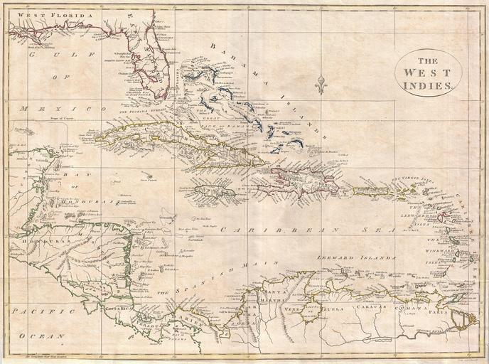 Keywords: 1799 Clement Cruttwell Map of West Indies - Geographicus - WestIndies-cruttwell-1799.jpg A fine 1799 map of the West Indies by the English mapmaker Clement Cruttwell Shows what was then known as West and East Florida along with the Bahamas Islands Cuba Jamaica Domingo and Puerto Rico Porto Rico Further southeast are the Virgin Islands the Leeward and Windward Islands The map also includes parts of Mexico Honduras Costa Rica and the northern portion of South America Cruttwell pays special attention to reefs shoals banks and other underwater dangers labeling many by name He also makes note of the Spanish Main the common term for A fine 1799 map of the West Indies by the English mapmaker Clement Cruttwell Shows what was then known as West and East Florida present day Florida Alabama and Louisiana along with the Bahamas Islands Cuba Jamaica Domingo and Puerto Rico Porto Rico Further southeast are the Virgin Islands the Leeward and Windward Islands The map also includes parts of Mexico Honduras Costa Rica and the northern portion of South America Cruttwell pays special attention to reefs shoals banks and other underwater dangers on this map labeling many by name Though generally quite accurate there are a number of interesting errors Charlotte Bay Florida he expands into a great inland Lagoon called Spiritu Santo Lake Nicaragua is overly large and suggestive of a practicality of building a canal to the Pacific He also makes note of the Spanish Main mainland coast of the Spanish Empire around the Caribbean Sea and the Gulf of Mexico The Spanish Main was the point of departure for enormous wealth that was shipped back to Spain in the form of gold silver gems spices hardwoods hides and other riches; because of this the area was ripe territory for pirates and privateers Outline color and fine copper plate engraving in the minimalist English style prevalent in the late 18th and early 19th centuries Mountains and topographical other detail shown by profile Also makes note of rivers and shoals Drawn by Clement Cruttwell and published in the 1799 Atlas to Cruttwell's Gazetteer the mainland coast of the Spanish Empire around the Caribbean Sea and the Gulf of Mexico The Spanish Main was the point of departure for enormous wealth that was shipped back to Spain in the form of gold silver gems spices hardwoods hides and other riches; because of this the area was ripe territory for pirates and privateers Outline color and fine copper plate engraving in the minimalist English style prevalent in the late 18th and early 19th centuries Mountains and topographical other detail shown by profile Also makes note of rivers and shoals Drawn by Clement Cruttwell and published in the 1799 Atlas to Cruttwell's Gazetteer 1799 dated Size in 19 14 object history credit line accession number WestIndies-cruttwell-1799 Cruttwell C <i>Atlas to Cruttwell's Gazetteer</i> 1799 Geographicus-source PD-Art-100 1799 maps Old maps of the Caribbean Old maps of Central America Caribbean in the 1790s Maps in English Maps by Clement Cruttwell |