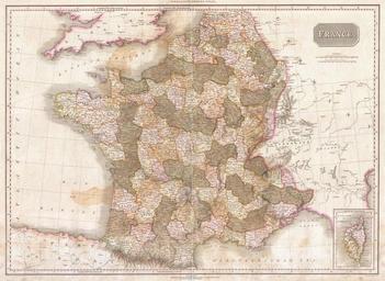 | Keywords: 1818 Pinkerton Map of France - Geographicus - France-pinkerton-1818.jpg Pinkerton's extraordinary 1818 map of France Covers the entire country from the Bay of Biscay to the English Channel to the Mediterranean to the borders with Switzerland and Germany Drawn shortly after the Napoleonic Wars Divided according to departments An inset of Corsica appears in the lower right quadrant Offers considerable detail with political divisions and color coding at the regional level Identifies cities towns castles important battle sites castles swamps mountains and river ways Title plate in the upper right quadrant Two mile scales in French Leagues and British Statute Miles also appear in the upper right quadrant Drawn by L Herbert and engraved by Samuel Neele under the direction of John Pinkerton This map comes from the scarce American edition of Pinkerton ™s Modern Atlas published by Thomas Dobson Co of Philadelphia in 1818 1818 undated Size in 28 20 5 object history credit line accession number France-pinkerton-1818 Pinkerton J <i>A Modern Atlas from the Lates and Best Authorities Exhibiting the Various Divisions of the World with its chief Empires Kingdoms and States; in Sixty Maps carefully reduced from the Larges and Most Authentic Sources </i> 1818 Philadelphia Thomas Dobson Edition Geographicus-source PD-old-100 Maps by John Pinkerton Old maps of the history of France 1818 maps |