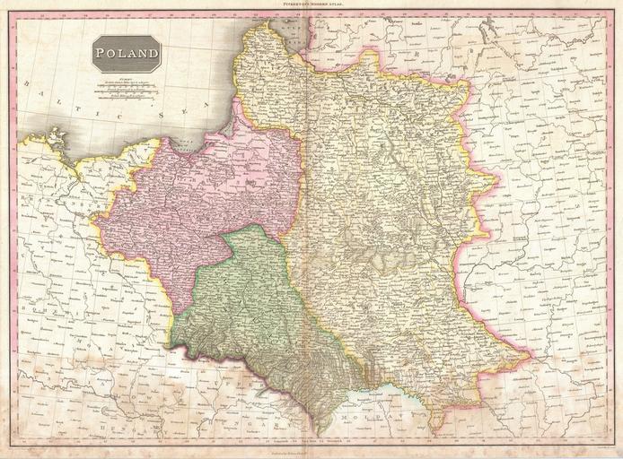 Keywords: 1818 Pinkerton Map of Poland - Geographicus - Poland-pinkerton-1818.jpg Pinkerton's extraordinary 1818 map of Poland Depicts the Polish state following the Third Partition of 1795 and before it was reconstituted by Napoleon as the Duchy of Warsaw Shows the state divided into three zones East Prussia Galicia and Russian Poland or the region that once constituted the core of the Grand Duchy of Lithuania Identifies cities towns castles important battle sites castles swamps mountains and river ways Upper left hand quadrant features three scales British Miles French Leagues and Polish Miles Drawn by L Herbert and engraved by Samuel Neele under the direction of John Pinkerton This map comes from the scarce American edition of Pinkerton ™s Modern Atlas published by Thomas Dobson Co of Philadelphia in 1818 1818 undated Size in 28 21 object history credit line accession number Poland-pinkerton-1818 Pinkerton J <i>A Modern Atlas from the Lates and Best Authorities Exhibiting the Various Divisions of the World with its chief Empires Kingdoms and States; in Sixty Maps carefully reduced from the Larges and Most Authentic Sources </i> 1818 Philadelphia Thomas Dobson Edition Geographicus-source PD-old-100 Maps by John Pinkerton Old maps of Poland 1818 maps Old maps of Lithuania under Russian and German empires Old maps of Prussia English language maps of Europe |