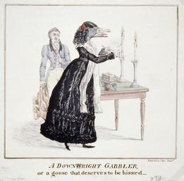 | Keywords: 1829-Frances-Wright-goose-caricature.jpg A Down<s>W</s>right Gabbler or a goose that deserves to be hissed -- an 1829 caricature which takes a hostile view of Frances Wright's public lectures Many at the time considered the mere fact of a woman lecturing in public to be a shameless act of brazen impudence and effrontery in itself regardless of the particular content of her lecture and the fact that Wright preached radical views of slavery abolition and giving women the right to vote only increased the criticism she received The caricature depicts her with a goose's beak and eyes wearing a somewhat unfashionably high-waisted and narrow-sleeved black dress and reading from a book as she lectures A young man with a somewhat vacant look and a hand tucked into one side of his vest à la Napoleon patiently holds her bonnet This was probably intended to be interpreted as going a little bit beyond an ordinary daily act of chivalry into a more or less subserviently deferential role Edited from image http //memory loc gov/master/pnp/cph/3b40000/3b48000/3b48500/3b48500u tif at the Library of Congress website ---- Bibliographic information found on the LoC site TITLE A downright gabbler or a goose that deserves to be hissed / Published by James Akin Philada CALL NUMBER PGA - Akin--Downright gabbler A size P P REPRODUCTION NUMBER LC-USZC2-599 color film copy slide LC-USZ62-88788 b w film copy neg SUMMARY Caricature of Frances Fanny Wright British-born activist exponent of female suffrage and outspoken critic of slavery The title's reference to Wright as a gabbler probably alludes to her sensational American lecture tour of 1829 Wright wears a black dress and long white scarf and has the head of a goose She stands reading from a book and gesturing before a speaker's table with candles pitcher glass and books Behind her stands a young man holding her bonnet and looking on Mrs <s>Kemble</s> Wright's costume and the scene itself -- with its table water candles and acolyte-like attendant -- seems intended to suggest an underlying parallel with liturgical rites MEDIUM 1 print on wove paper lithograph with watercolor; image 20 x 19 9 cm CREATED/PUBLISHED 1829 CREATOR Akin James ca 1773-1846 artist NOTES Title appears as written on print Quimby no 51 Published in American political prints 1766-1876 / Bernard F Reilly Boston G K Hall 1991 entry 1829-2 TOPICS Wright Frances FORMAT Caricatures 1820-1830 Lithographs Hand-colored 1820-1830 REPOSITORY Library of Congress Prints and Photographs Division Washington D C 20540 USA DIGITAL ID color film copy slide cph 3b48500 http //hdl loc gov/loc pnp/cph 3b48500 b w film copy neg cph 3b35204 http //hdl loc gov/loc pnp/cph 3b35204 CARD 2002708975 Edited from image http //memory loc gov/master/pnp/cph/3b40000/3b48000/3b48500/3b48500u tif 1829 James Akin ca 1773-1846 PD-old-100 Frances Wright 1829 cartoons 1829 in the United States Black clothing in art female Geese in art Gender-role reversals or women in power 19th-century caricatures Hand-in-waistcoat People with candles in art People with scarves in art Candlestands lighting devices |