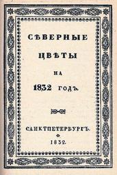 Keywords: Северные цветы на 1832 год. Обложка.jpg en The title page of the Severnie tsveti russian Севе ные цветы literary miscellany of Anton Delvig Published by Alexander Pushkin 1832 ru Лите ату ный альманах Дельвига Севе ные цветы Обложка изданных А С Пушкиным Севе ных цветов на 1832 год Сделал сам Author 1832 PD-old Title pages from Russia Severnie tsvety 1832 books |