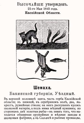 | Keywords: Шемаха 1843 из Винклера.jpg  Official Russian Empire coat of arms Shemaha Ге б Российской Импе ии уездного го ода Шемаха Бакинской губе нии в 1843 - админист ативного цент а Каспийской области с официальным описанием в Ге бовнике Винкле а П П фон-Винкле Ге бы го одов губе ний областей и посадов Российской Импе ии внесенные в Полное Соб ание законов с 1649 по 1900 год Дозволено цензу ою С -Пете бу г 20 Июля 1899 года Издание книгото говца Ив Ив Иванова С -Пете бу г Типог афия И  Комелова П яжка д 3 1899 \ Scanned by Vizu 1843 \ 1899 published П П фон Винкле \ Pavel von Vinkler PD-old PD-RusEmpire PD-RU-exempt coats of arms BadJPEG Gerbovnik Vinklera - City CoAs Coats of arms of Baku Governorate Kaspii Oblast Coats of arms of Shamakhi Fish in heraldry |