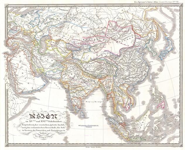 | Keywords: 1844 Spruneri Map of Asia in the 15th and 16th Centuries (Ming China) - Geographicus - AsiaXVXVI-spruneri-1855.jpg This fascinating hand colored map depicts Asia in the 15th and 16th centuries This period roughly corresponds to the Ming Dyansty in China the incursions of Persia and Portugal in India and the beginning of the Russian Expansion The Timur dynasty ruled Persia Singapur Singapor is labeled All text is in German Issued in the 1870 edition of Stieler ™s Hand Atlas 1844 Size in 17 14 object history credit line accession number AsiaXVXVI-spruneri-1855 Geographicus-source PD-old-100 1844 maps Old maps of Asia Maps in German Karl Spruner von Merz Maps showing history of Asia Old maps showing history Maps showing 15th-century history Maps showing 16th-century history |