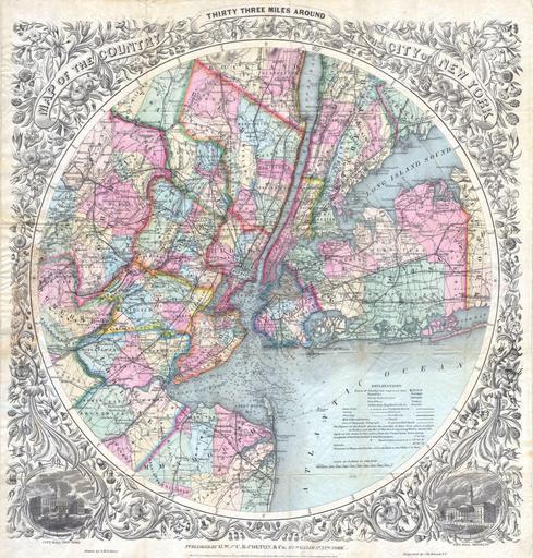 | Keywords: 1846 - 1879 Colton Map of New York City ^ Vicinity (33 Miles Around) - Geographicus - NYC33Miles-colton-1879.jpg This is the extremely rare 1879 edition of one of the most beautiful pocket maps of New York made in the 19th century Colton ™s Thirty Three Miles Around the City of New York Covers New York City and vicinity as far south as Ocean County NY as far east as Suffolk County as far north as Rockland County and as far west as Somerset County Reveals the area in considerable detail with special attention to settlements tolls roads and railroads Documents innumerable areas of interest included the New Lots in Brooklyn and a very early Central Park New York Bay and Harbor offers numerous depth soundings taken from the 1858 U S Coast Survey of the region Surrounded by a splendid decorative border with engraved views depicting City Hall New York and City Hall Brooklyn This map was drawn and engraved by J M Atwood based upon J H Eddy ™s 1811 map of the same name Colton ™s success with this attractive map was such that it was issued in various editions for over 50 years Haskell notes eight different editions between 1846 and 1873 and Rumsey has a variant dated 1891 We have found no references to our 1879 variant in any major collection or reference work Folds into its original dark green linen binder Miniature map of the city in gilt stamped on the cover Dated 1870 under the title and at the base of the map the copyright reads Entered according to the Act of Congress in the Year of 1846 by J H Colton Co in the Clerk ™s Office of the District Court of the Southern District of New York Published by Johnson Browning from their 172 William Str Office in New York City 1879 dated Size in 22 5 24 object history credit line accession number NYC33Miles-colton-1879 Hand Color Geographicus-source PD-old-100 Old maps of New York City 1879 1879 maps Maps by Joseph Hutchins Colton Round maps Maps in English New York City Hall Brooklyn Borough Hall |