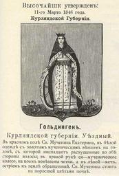 | Keywords: Гольдинген 1846 из Винклера.jpg Official Russian Empire coat of arms Goldingen Kurlandia Governorate Ге б Российской Импе ии уездного го ода Гольдинген Ку ляндской губе нии с изоб ажением мученицы святой Екате ины с официальным описанием в Ге бовнике Винкле а П П фон-Винкле Ге бы го одов губе ний областей и посадов Российской Импе ии внесенные в Полное Соб ание законов с 1649 по 1900 год Дозволено цензу ою С -Пете бу г 20 Июля 1899 года Издание книгото говца Ив Ив Иванова С -Пете бу г Типог афия И Комелова П яжка д 3 1899 \ Scanned by Vizu 1846-03-11 \ 1899 published П П фон Винкле \ Pavel von Vinkler PD-old PD-RusEmpire PD-RU-exempt coats of arms Gerbovnik Vinklera - City CoAs Coats of arms of Kurlandia Governorate Ermine clothing in art Katherine Swords in heraldry Kreis Goldingen |