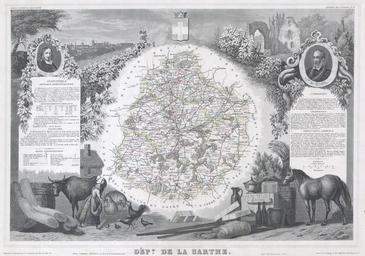 | Keywords: 1847 Levasseur Map of Sarthe, France - Geographicus - Sarthe-levasseur-1847.jpg This is a fascinating 1847 map of the French department of Sarthe surrounding the city of Le Mans Sarthe is a Loire valley wine growing region that specializes in the lesser known French varietals of Jasnieres and Coteaux du Loir It is also one of the primary areas where the oak barrels for many European wines are produced The whole is surrounded by elaborate decorative engravings designed to illustrate both the natural beauty and trade richness of the land There is a short textual history of the regions depicted on both the left and right sides of the map 1847 Size in 17 12 object history credit line accession number Sarthe-levasseur-1847 Geographicus-source PD-old-100 <gallery>File 1852 Levasseur Map of the Department De La Sarthe France - Geographicus - Sarthe-levasseur-1852 jpg</gallery> Victor Levasseur - Maps of France 1847 maps Old maps of Sarthe Charles Ier de Cossé Coats of arms of Le Mans Maps in French Engravings of animals Animals on maps Wine barrels in art |