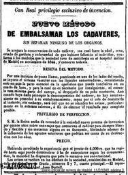 | Keywords: 1848-embalsamar-cadaveres.jpg it Annuncio pubblicitario relativo a un nuovo metodo per imbalsamare i cadaveri senza separare alcun organo 11 2 1848 Diario oficial de Avisos de Madrid 11 2 1848 pag 3 Albertomos Con Real privilegio esclusivo de invencion Nuevo metodo de embalsamar los cadaveres sin separar ninguno de los organos Se asegura la conservacion de todo cadaver sea lo cual fuere la edad sexo estado de gordura y enfermedad de que hubiere fallecido el individuo conforme a los modelos que la sociedad tuvo de manifiesto en el hospital militar de Madrid en noviembre de 1844 y conserva todavia RESENA DEL METODO Por una incision de pocas lineas practicada en uno de los lados del cuello se inyecta el sistema vascular con los liquidos conservadores consistiendo solo en eso la parte esencial de la operacion que puede concluirse en un cuarto de hora y para la cual no es necesario por consiguiente ni estrar la mas minima parte del cuerpo ni despojarle de su paño mortuorio Aun cuando haya dado principio la descomposicion del cadaver no hay inconveniente en proceder a su embalsamamiento capaz por si solo de contenerla al instante; sin embargo serà util que no retarden los avisos particularmente en la estacion calorosa a fin de obtener el resultado mas completo posible PRIVILEGIO DE PERFECTION S M la Reina acaba de conceder a la sociedad nueva patente de invencion por quince años sobre unas cajas que conservan el cadaver para siempre blando y flexible y sin mutacion alguna en su fisionomia librandole ademas de la influencia de los agentes esteriores que podrian ser causa de su destruccion con los años PRECIO Habiendo acreditado la esperiencia que el precio de 4 000 rs que ha regido hasta aqui puede desminuirse ò ha de aumentarse segun las circustancias la sociedad ha dispuesto que para lo sucesivo sea convencional Los avisos se reciben en las oficinas de la sociedad establecidas en Madrid calle del Caballero de Gracia numero 5 y 7 cuarto principal - El representante de la sociedad Juan Borrell PD-old Uploaded with UploadWizard 1848 advertisements in Spain Diario oficial de Avisos de Madrid advertisements Undertakers advertisements ImageNote 1 24 20 349 504 405 551 2 Con Real privilegio esclusivo de invencion Nuevo metodo de embalsamar los cadaveres sin separar ninguno de los organos Se asegura la conservacion de todo cadaver sea lo cual fuere la edad sexo estado de gordura y enfermedad de que hubiere fallecido el individuo conforme a los modelos que la sociedad tuvo de manifiesto en el hospital militar de Madrid en noviembre de 1844 y conserva todavia RESENA DEL METODO Por una incision de pocas lineas practicada en uno de los lados del cuello se inyecta el sistema vascular con los liquidos conservadores consistiendo solo en eso la parte esencial de la operacion que puede concluirse en un cuarto de hora y para la cual no es necesario por consiguiente ni estrar la mas minima parte del cuerpo ni despojarle de su paño mortuorio Aun cuando haya dado principio la descomposicion del cadaver no hay inconveniente en proceder a su embalsamamiento capaz por si solo de contenerla al instante; sin embargo serà util que no retarden los avisos particularmente en la estacion calorosa a fin de obtener el resultado mas completo posible PRIVILEGIO DE PERFECTION S M la Reina acaba de conceder a la sociedad nueva patente de invencion por quince años sobre unas cajas que conservan el cadaver para siempre blando y flexible y sin mutacion alguna en su fisionomia librandole ademas de la influencia de los agentes esteriores que podrian ser causa de su destruccion con los años PRECIO Habiendo acreditado la esperiencia que el precio de 4 000 rs que ha regido hasta aqui puede desminuirse ò ha de aumentarse segun las circustancias la sociedad ha dispuesto que para lo sucesivo sea convencional Los avisos se reciben en las oficinas de la sociedad establecidas en Madrid calle del Caballero de Gracia numero 5 y 7 cuarto principal - El representante de la sociedad Juan Borrell ImageNoteEnd 1 |