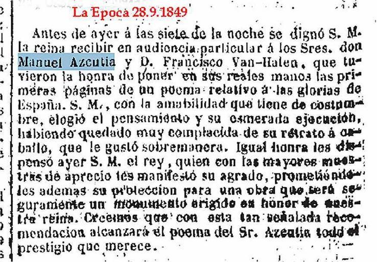 | Keywords: 1849-Manuel-Azcutia-audiencia-particular.jpg es Antes de ayer a las siete de la noche se dignò S M La reina recibir en audencia particular a los Sres Don Manuel Azcutia y D Francisco Van-Halen que tuvieron la honra de poner en sus reales manos las primeras paginas de un poema relativo a las glorias de España S M con la amabilidad que tiene de costumbre elogiò el pensamiento y su esmerada ejecucion habiendo quedado muy complacida de su retrato a caballo que le gustò sobremanera Igual honra les dispenso ayer S M el rey quien con las mayores muestras de aprecio les manifestò su agrado prometiendoles ademas su proteccion para una obra que serà seguramente un monumento erigido en honor de nuestra reina Creemos que con esta tan señalada recomendacion alcanzaarà el poema del sr Azcuti todo el prestigio que merece 1849-09-28 La Epoca Madrid 28 9 1849 La Epoca other versions PD-old Uploaded with UploadWizard La Epoca Madrid Manuel Lopez de Azcutia 1849 in Madrid |