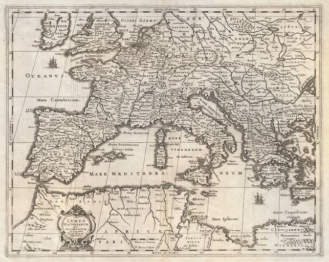 | Keywords: 1852 Jansson Map of Europe in Antiquity - Geographicus - EuropeAncient-jansson-1652.jpg An exceptional c 1652 map of Europe by Jan Jansson Centered on Italy this map covers from Spain to Greece and from England to northern Africa Designed by Frans van Haren Haraeus a Dutch theologian and globe maker active from about 1615 to 1624 Depicts Europe as know to the Ancients Cartographically this map exhibits heavy influence from a very similar map of the same name published by A Ortelius in his 1597 Parergon Based on Greek and Roman sources including Pliny Strabo Virgil Caesar and others Ships and monsters decorate the seas A decorative baroque title cartouche appears in the lower left quadrant This remarkable map was published in volume six the Orbis Antiquus of Jan Jansson's Novus Atlas 1652 undated Size in 19 5 15 5 object history credit line accession number EuropeAncient-jansson-1652 Jansson J <i>Novus Atlas Sive Theatrum Orbis Terrarum In quo Orbis Antiquus Seu Geographia Vetus Sacra Profana exhibetur</i> Volume 6 1657 Geographicus-source PD-old-100 Old maps of Europe 1652 1652 maps Maps by Jan Jansson Maps in Latin |