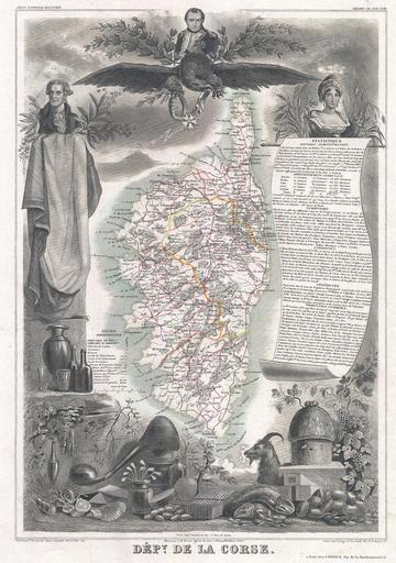 | Keywords: 1852 Levasseur Map of Corsica ( La Corse ), France - Geographicus - Corsica-levasseur-1852.jpg A visually stunning decorative map of Corsica La Corse dating to 1852 by French map publisher Victor Levasseur Levasseur published several different editions of his Corsica map - this being first The island of Corsica is drawn inconsiderable detail showing its many forests roadways cities and three primary districts By far this map's most striking feature is its elaborate allegorical border work Levasseur composed this map for publication in his magnificent Atlas Nacionale de la France Illustree one of the most decorative and beautifully produced atlases to appear in the 19th century This particular map is surrounded on all sides with elaborate illustrative border work showing the cultural natural and trade richness of Corsica Napoleon Bonaparte Corsica's most celebrated son appears at the top of the map over a great imperial Eagle To his right and left appear Paoli a Corsican Nationalist Leader and Loetitia Napoleon's mother The remainder of the decorative border work is given to displacing the the many products of Corsica including Goats honey wines distilled spirits seafood cheese and sardines Publised by V Levasseur in the 1852 edition of his Atlas National de la France Illustree 1852 undated Size in 12 5 16 5 object history credit line accession number Corsica-levasseur-1852 Levassuer V <i>Atlas National Illustre des 86 Departements et des Possessions de La France Divise par Arrondissements Cantons et Communea avec La Trace de Toutes Les Routes Chemins de fer et Canaux </i> 1852 edition Geographicus-source PD-old-100 Victor Levasseur - Maps of France Old maps of Corsica 1852 maps Portraits of Napoleon I of France French Imperial Eagles Pasquale Paoli Letizia Ramolino 1852 Maps in French |