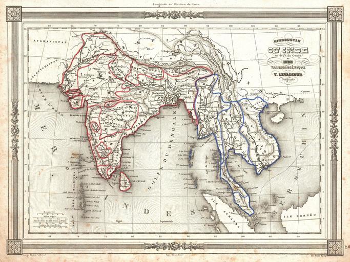 | Keywords: 1852 Levasseur Map of India and Southeast Asia - Geographicus - India-levassuer-1852.jpg  A beautiful 1852 map of India and Southeast Asia by Victor Levasseur Features the entire sub-continent as well as all of Southeast Asia Includes the modern day nations of India Pakistan Bangladesh Nepal Thailand Vietnam Cambodia Laos Burma and Malaysia Identifies major cities rivers mountains and various other topographical features Features a neoclassical decorative border Prepared by V Levasseur for publication as plate no 23 in Maison Basset ™s 1852 edition of the Atlas Illustre 1852 undated Size in 13 10 object history credit line accession number India-levassuer-1852 Duvotenay T <i>Atlas Illustre</i> Maison Basset 1852 Geographicus-source PD-old-100 Victor Levasseur - Maps of the world Old maps of the Indian Subcontinent 1852 maps of India Old maps of Southeast Asia Maps in French |
