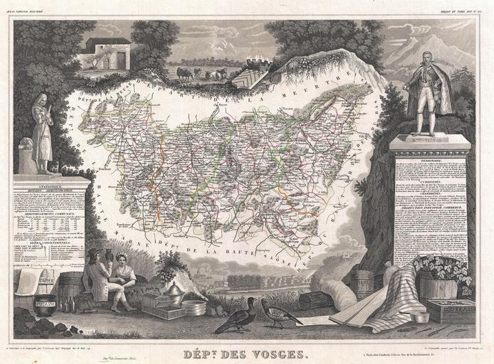Keywords: 1852 Levassuer Map of the Department Des Vosges, France - Geographicus - Vosges-levassuer-1852.jpg This is a fascinating 1852 map of the French department of Vosges France This mountainous area is part of the Alsace wine region The map proper is surrounded by elaborate decorative engravings designed to illustrate both the natural beauty and trade richness of the land There is a short textual history of the regions depicted on both the left and right sides of the map Published by V Levasseur in the 1852 edition of his Atlas National de la France Illustree 1852 undated Size in 16 12 object history credit line accession number Vosges-levassuer-1852 Levassuer V <i>Atlas National Illustre des 86 Departements et des Possessions de La France Divise par Arrondissements Cantons et Communea avec La Trace de Toutes Les Routes Chemins de fer et Canaux </i> 1852 edition Geographicus-source PD-old-100 Victor Levasseur - Maps of France France 1852 maps France Old maps of Vosges |