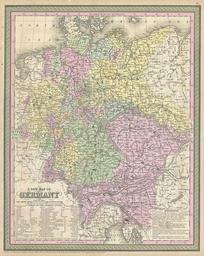 | Keywords: 1853 Mitchell Map of Germany - Geographicus - Germany-mitchell-1850.jpg An attractive example of S A Mitchell Sr ™s 1853 map of Germany Depicts the entire country color coded according to individual German states Unlike most of Mitchell's European series this map did not appear in all editions of the Atlas It was prepared in 1853 to replace and earlier smaller map of the same region - despite this Mitchell chose to save money by not updating the copyright hence it is still dated to 1850 Surrounded by the green border common to Mitchell maps from the 1850s Prepared by S A Mitchell for issued as plate no 52 in the 1853 edition of his New Universal Atlas Dated and copyrighted Entered according to act of Congress in the year 1850 by Thomas Cowperthwait Co in the Clerks office of the District court of the Eastern District of Pennsylvania 1853 dated 1850 Size in 12 5 16 object history credit line accession number Germany-mitchell-1850 Mitchell Sr S A <i>A New Universal Atlas Containing Maps of the various Empires Kingdoms States and Republics Of The World </i> 1853 issue Geographicus-source PD-old-100 Maps by Samuel Augustus Mitchell Old maps of Germany Old maps of Bohemia Old maps of Austria 19th-century maps of Moravia 1853 maps English language maps of Europe |