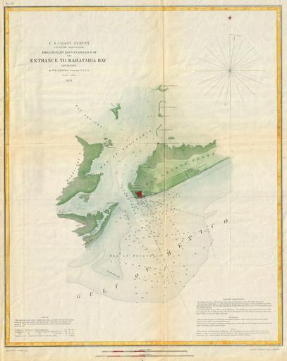 | Keywords: 1853 U.S. Coast Survey Map or Chart of Bartaria Bay, Louisiana - Geographicus - BaratariaBay-uscs-1853.jpg This is an attractive 1853 U S Coast Survey chart or nautical map or Barataria Bay Louisiana Covers from Grand Isle and Bayou Rigaud eastward Past Fort Livingston and Forstall ™s Plantation Extends northward past Mendicant Island to Independence Island and the Bay aux Chats Includes notes on tides in the lower left hand quadrant and sailing instructions in the lower right Barataria Bay just south of New Orleans is part of the series of swamps bays and canals that make up the Mississippi River Delta In the early 19th century this bay used as the base of the privateers led by Jean Lafitte Today the bay is known for its rich resources most notably shrimp and sulfur muskrat furs natural gas and oil The cartography for this map was accomplished by F H Gerdes under the supervision of A D Bache director of the U S Coast Survey 1853 dated Size in 14 17 object history credit line accession number BaratariaBay-uscs-1853 <i>Report of the Superintendant of the U S Coast Survey </i> 1853 edition Geographicus-source PD-art United States Coast Survey maps Old maps of Louisiana 1853 maps 1853 in Louisiana Fort Livingston Louisiana |