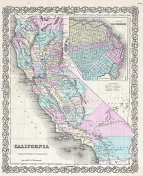 | Keywords: 1855 Colton Map of California and San Francisco - Geographicus - California-colton-1855.jpg Issued roughly six years after the 1849 California Gold Rush this is a beautiful 1855 first edition first state example of Colton's map of California Colton's California with its San Francisco inset is one of the rarest and most desirable of all Colton atlas maps as it beautifully illustrates the rapid development throughout the state that followed in the wake of the Sutter's Mill discovery Like most of Colton's state maps this map was derived from an earlier wall map of North America produced by Colton and D Griffing Johnson Covers the entire state of California with a large inset of San Francisco in the upper right quadrant Colton identifies a number of important emigrant and exploratory routes including Fremont's Route and three proposed routes for the Atlantic - Pacific Railroad The Beswith route comes into the state near Pyramid Lake before turning south to terminate in San Francisco At the bottom of them map are two forks of the Parke Route which ran through New Mexico before splitting off into two routes one of which terminated in San Diego the other of which ran up the coast to San Francisco Offers a detailed treatment of the California gold region is Sacramento Valley but makes no specific mention of gold deposits This map further identifies various forts rivers mountain passes fords and an assortment of additional topographical details Map is hand colored in pink green yellow and blue pastels to define territory and state boundaries Surrounded by Colton's typical spiral motif border Dated and copyrighted to J H Colton 1855 Published from Colton's 172 William Street Office in New York City Issued as page no 52 in volume 1 of the first edition of George Washington Colton's 1855 Atlas of the World 1855 dated Size in 13 16 object history credit line accession number California-colton-1855 Colton G W <i>Colton's Atlas of the World Illustrating Physical and Political Geography</i> Vol 1 New York 1855 First Edition Geographicus-source PD-art Old maps of California Old maps of San Francisco Topographic maps of California Old California in the 1850s 1855 maps |