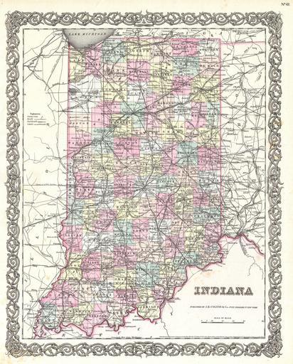 | Keywords: 1855 Colton Map of Indiana - Geographicus - Indiana-colton-1855.jpg A beautiful 1855 first edition example of Colton's map of Indiana Covers Indiana in full as well as parts of adjacent states Like most of Colton's state maps this map is largely derived from an earlier wall map of North America produced by Colton and D Griffing Johnson Colton identifies various cities towns forts rivers rapids fords and an assortment of additional topographical details Map is hand colored in pink green yellow and blue pastels to define county and state boundaries Surrounded by Colton's typical spiral motif border Dated and copyrighted to J H Colton 1855 Published from Colton's 172 William Street Office in New York City Issued as page no 41 in volume 1 of the first edition of George Washington Colton's 1855 Atlas of the World 1855 dated Size in 13 16 object history credit line accession number Indiana-colton-1855 Colton G W <i>Colton's Atlas of the World Illustrating Physical and Political Geography</i> Vol 1 New York 1855 First Edition Geographicus-source PD-old-100 Maps by Joseph Hutchins Colton Old maps of Indiana 1855 maps |
