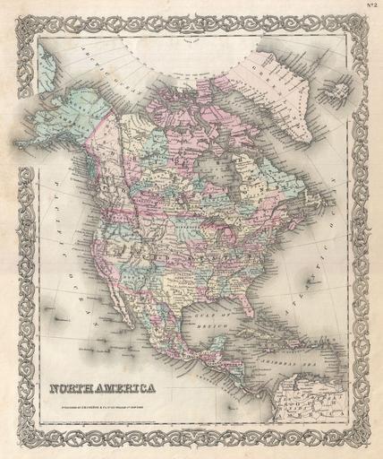 Keywords: 1855 Colton Map of North America - Geographicus - NorthAmerica-colton-1855.jpg An excellent first edition example of Colton's rare map of North America Covers the continent from South America to the Arctic inclusive of the United States Canada Mexico Central America and the West Indies The United States portion of this map contains a early territorial configuration of the Transmississippi Nebraska is shown at its fullest extending from Kansas to the Canadian border Montana Wyoming Idaho Arizona Colorado West Virginia and Nevada do not yet appear on the map Notes Russian claims to Alaska Identifies Pikes Peak Fremont's Peak Mt Rainier Mt St Helens and the Three Tetons Hand colored in pink green yellow and blue pastels Surrounded by Colton's typical spiral motif border Dated and copyrighted to J H Colton 1855 Published as page no 2 in volume 1 of the first edition of George Washington Colton's 1855 Atlas of the World 1855 dated Size in 13 16 object history credit line accession number NorthAmerica-colton-1855 Colton G W <i>Colton's Atlas of the World Illustrating Physical and Political Geography</i> Vol 1 New York 1855 First Edition Geographicus-source PD-old-100 Maps by Joseph Hutchins Colton Old maps of North America 1855 maps |