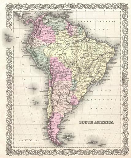 | Keywords: 1855 Colton Map of South America - Geographicus - SouthAmerica-colton-1855.jpg An excellent first edition example of Colton's rare 1855 map South America Covers the entire continent from the Caribbean to Tierra del Fuego and from the Pacific to the Atlantic Includes the Galapagos Juan Fernandez Falkland and South Georgia island groups Throughout the map Colton identifies various cities towns forts rivers rapids fords and an assortment of additional topographical details Map is hand colored in pink green yellow and blue pastels to define national and regional boundaries Surrounded by Colton's typical spiral motif border Dated and copyrighted to J H Colton 1855 Published as page no 58 in volume 1 of the first edition of George Washington Colton's 1855 Atlas of the World 1855 dated Size in 13 16 object history credit line accession number SouthAmerica-colton-1855 Colton G W <i>Colton's Atlas of the World Illustrating Physical and Political Geography</i> Vol 1 New York 1855 First Edition Geographicus-source PD-old-100 1855 maps Old maps of South America Maps in English |