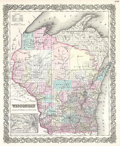 | Keywords: 1855 Colton Map of Wisconsin - Geographicus - Wisconsin-colton-1855.jpg A beautiful 1855 first edition example of Colton's map of Wisconsin Covers the entire state as well as adjacent parts of Minnesota and upper Michigan Like most of Colton's state maps this map is largely derived from an earlier wall map of North America produced by Colton and D Griffing Johnson Colton identifies various cities towns forts rivers rapids fords and an assortment of additional topographical details Map is hand colored in pink green yellow and blue pastels to define county and state boundaries Surrounded by Colton's typical spiral motif border Dated and copyrighted to J H Colton 1855 Published from Colton's 172 William Street Office in New York City Issued as page no 48 in volume 1 of the first edition of George Washington Colton's 1855 Atlas of the World 1855 dated Size in 13 16 object history credit line accession number Wisconsin-colton-1855 Colton G W <i>Colton's Atlas of the World Illustrating Physical and Political Geography</i> Vol 1 New York 1855 First Edition Geographicus-source PD-old-100 Maps by Joseph Hutchins Colton Old maps of Wisconsin 1855 maps |