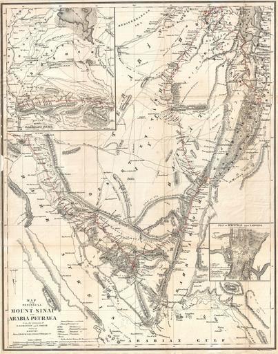 | Keywords: 1856 Kiepert Map of the Sinai Peninsula, Egypt - Geographicus - Sinai-kiepert-1856.jpg An uncommon map of the Sinai Peninsula by the classical scholar and cartographer H Kiepert Covers from the Red Sea to the Arabian Peninsula This map is based on the 1838 travels of E Robinson and E Smith in this area Robinson and Smith in search of unidentified Biblical sites traveled throughout the Middle East but most particularly in modern day Israel Palestine Lebanon Egypt Jordan and Syria The duo used local traditions as well as established Biblical scholarship to identify a number of important sites This map is largely the result of their research and work Their route shown in red leads from Cairo eastward through Suez then south skirting the rugged interior to Mount Sinai then northwards past Aqaba into modern day Israel Most place names are transliterations of Arabic though biblical references are included where appropriate There are two inset maps The first in the upper left quadrant focuses on the Cairo-Suez portion of the journey The second map in the lower right details part of the remarkable ruined city of Petra known as the Rose red city half as old as time This map was drawn by Heinrich Kiepert a noted expert on historical cartography for Robinson ™s important work Biblical Researches in Palestine and in the Adjacent Regions 1856 undated Size in 16 75 21 5 object history credit line accession number Sinai-kiepert-1856 Robinson E and Smith E <i>Biblical Researches in Palestine and in the Adjacent Regions A Journal of Travels in the Year 1838 </i> Boston Crocker Brewster 1856 Geographicus-source PD-art Maps of the Sinai Peninsula 1856 1856 maps Old maps of Egypt Old maps of Israel Old maps of Jordan Edward Robinson |