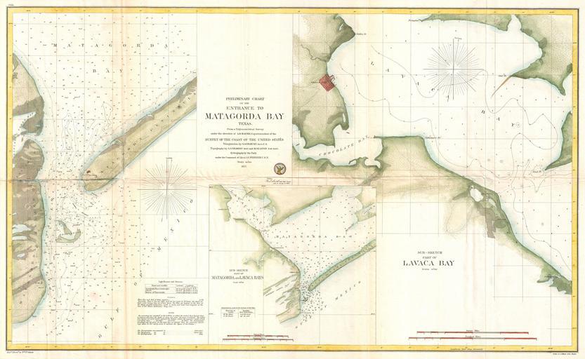 Keywords: 1857 U.S. Coast Survey Map of Matagorda Bay and Lavaca Bay, Texas - Geographicus - MatagordaBay-uscs-1857.jpg This is an uncommon 1857 U S Coast Survey Chart or Map of Matagorda Bay and Lavaca Bay in Texas Essentially three maps in one The primary map occupying the left portion of the sheet details the Entrance to Matagorda Bay Offers excellent detail of Matagorda Island and Matagorda Peninsula noting the Decros Point Beacon Another map it the upper right quadrants shows Lavaca Bay with wonderful detail of Lavaca City or as it is known today Lavaca Port Lower central map shows both Matagorda and Lavaca bays in relation to one another Countless depth soundings throughout Notes on tides lighthouses and sailing instruction in the lower left The Triangulation for this survey was completed by S A Gilbert The topography is the work of S A Gilbert and M Seaton They hydrography was accomplished by a party under the command of J C Febiger 1857 dated Size in 32 5 20 object history credit line accession number MatagordaBay-uscs-1857 <i>Report of the Superintendant of the U S Coast Survey </i> 1857 edition Geographicus-source PD-art United States Coast Survey maps 1857 maps Old maps of Texas Lavaca Bay Matagorda Bay |