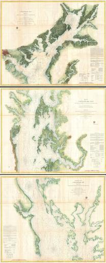 | Keywords: 1857 U. S. Coast Survey Map of the Chesapeake Bay (3 parts) - Geographicus - ChesapeakeBay3part-uscs-1857.jpg This is a monumental and rarely available three part 1857 nautical chart or maritime map of the Chesapeake Bay Prepared for the 1857 edition of the U S Coast Survey ™s Superintendent ™s Report this giant map covers from the top of the Chesapeake Bay and the mouth of the Susquehanna River to the mouth of the Potomac River The top or first chart covers from the head of the Bay to the Mouth of the Magothy River inclusive of the Patapsco River and the city of Baltimore “ which is detailed to the street level The second or middle chart covers from the Magothy River to the mouth of the Hudson River and includes Annapolis Cambridge and Easton This second chart also bears the title of the three map series in addition to its individual title The bottom or third chart in this series covers from the mouth of the Hudson River to the mouth of the Potomac River The United States Coast Survey considered the construction of a detailed map of the Chesapeake Bay to be one of its top priorities Various commands under Blunt Maffit Cutts Hassler Lee Nelson Gerdes and others contributed extensive data to the multi-year effort Careful observers will note that the upper sheets seem darker than the lower sheets In the effort to map this region the northern extremes of the Chesapeake Bay long considered the most dangerous and poorly charted where given precedence Thus does a density of data including countless depth soundings topographical data and sailing instructions give evidence to the stately progress of the survey in the Chesapeake Bay Each sheet from this series measures some 30 x 37 inches for an overall dimension of roughly 93 x 38 inches Though these maps do occasionally appear individually they are rarely available as a set and are exceptionally uncommon in such excellent condition Published under the supervision of A D Bache one of the most active and influential Superintendents of the U S Coast Survey 1857 dated Size in 38 93 object history credit line accession number ChesapeakeBay3part-uscs-1857 <i>Report of the Superintendant of the United States Coast Survey </i> Washington 1857 edition Geographicus-source PD-art United States Coast Survey maps Old maps of the Chesapeake Bay 1857 maps |