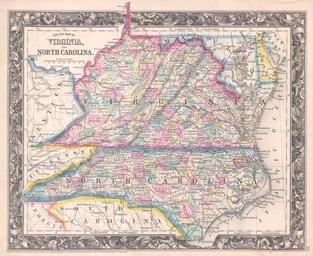 | Keywords: 1860 Mitchell Map of Virginia (undivided) and North Carolina - Geographicus - VANC-mitchell-1860.jpg One of the most difficult to find atlas maps issued by S A Mitchell Jr From the first edition 1860 of Mitchell ™s Mitchell ™s New General Atlas depicts a unified Virginia with North Carolina Includes parts of Kentucky Tennessee Maryland Georgia South Carolina and Delaware Denotes both political and geographical details including roads and proposed railroads One of the most attractive American atlas maps of this region to appear in the mid 19th century Features the floral border typical of Mitchell maps from the 1860-65 period Prepared by W Williams for inclusion as plate no 23 in the 1860 issue of Mitchell ™s New General Atlas Dated and copyrighted Entered according to Act of Congress in the Year 1860 by S A Mitchell Jr in the Clerk ™s Office of the District Court of the U S for the Eastern District of Pennsylvania 1860 dated Size in 13 5 11 25 object history credit line accession number VANC-mitchell-1860 <i>Mitchell's New General Atlas Containing Maps Of The Various Countries Of The World Plans Of Cities Etc Embraced In Forty-Seven Quarto Maps Forming A Series Of Seventy-Six Maps And Plans Together With Valuable Statistical Tables </i> 1860 first edition Geographicus-source PD-old-100 Maps by Samuel Augustus Mitchell Old maps of North Carolina Old maps of Virginia 1860 maps |
