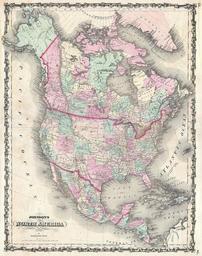 | Keywords: 1862 Johnson Map of North America - Geographicus - NorthAmerica-johnson-1862.jpg A beautiful example of A J Johnson ™s 1862 map of North America Offers a fascinating snapshot of North America particularly the United States Canada and Mexico just after the outbreak of the American Civil War States roughly follow the 1861 configuration with archaic borders between Nevada and California and Nevada and Utah whose capital is noted as Fillmore City This map does not show the fledgling Confederate Territory of Arizona Nebraska extends westward as far as Utah and a massive Washington State borders with Dakota Several important transcontinental routes are shown including the U S Mail Route through Texas and New Mexico and the Pony Express route to Sacramento Also notes numerous American Indian tribes throughout Canada and Mexico are shown in considerable detail with color coding according to region Features the strapwork style border common to Johnson ™s atlas work from 1860 to 1863 Published by A J Johnson and Ward as plate numbers 15 and 16 in the 1862 edition of Johnson ™s New Illustrated Family Atlas This is the first edition of the Johnson ™s Atlas to bear the Johnson Ward imprint 1862 undated Size in 17 5 22 object history credit line accession number s Geographical Statistical and Historical </i> 1862 A J Johnson Ward edition Geographicus-source PD-old-100 Maps by Alvin Jewett Johnson 1862 maps Old maps of North America |