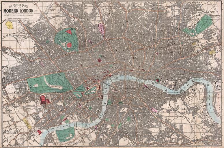 | Keywords: 1862 Reynolds Pocket Map of London, England - Geographicus - London-reynolds-1862.jpg A pristine example of James Reynolds ™ 1662 pocket map of London England Covers the center of London from Notting Hill to the Isle of Dogs and from Kentish Town to Battersea Park Details every street parks train station bridge monument pier and government building Tourist destinations such as the Botanical Gardens the Zoo Buckingham Palace the Tower of London and the British Museum are highlighted in red In addition to existing streets and buildings Reynolds ™ also details a proposed embankment along the northern shore of the Thames from Westminster Bridge to Blackfriars Bridge This eventually evolved into the Victoria Embankment which was constructed roughly as proposed between 1865 and 1870 This map folds into its original linen binders and is accompanied by a short visitors guides features notes on exhibits museums and galleries as well as a street index and an assortment of advertisements Reynolds first issued this map in 1857 It went through some thirty two subsequent editions eventually evolving into Smith ™s Tape Indicator Map of London This edition the sixth is notable for its inclusion of the Victoria Embankment “ a novelty given that work on the embankment did not begin until three years after this map was printed 1862 dated Size in 29 5 19 5 object history credit line accession number London-reynolds-1862 Reynolds J <i>Reynolds's Map of London and Visitors Guide</i> 1862 Geographicus-source PD-art Old maps of London 1862 maps |