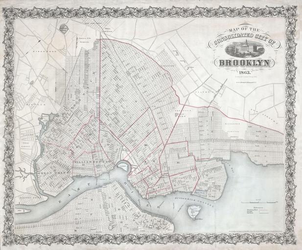 | Keywords: 1863 McCloskey Pocket Map of Brooklyn, New York - Geographicus - Brooklyn-mccloskey-1863.jpg An extremely rare first edition of Henry McCloskey ™s 1863 pocket map of the city of Brooklyn New York In the mid 19th century fueled by the advent of the steam ferry which made crossing the East River practical Kings County experienced an massive population burst Wealthy and poor alike were quick to abandon the dirty and claustrophobic Manhattan for then suburban lands just across the East River In 1855 the communities of Brooklyn Greenpoint Bushwick and Williamsburg were consolidated by the State of New York into one large city modern day Brooklyn It was around this time that the term Kings County began to fall out of popular usage in favor of Brooklyn By 1865 two years after this map was printed Brooklyn had become the third largest city in America following New York and Philadelphia Here Brooklyn is revealed in the midst of this incredible development Prospect Park which was still being built is shown as is Greenwood cemetery The street layout mimicking the grid system of Manhattan is shown in considerable detail Attemptes to detail important buildings ferry crossings bridges train lines and plank roads Also notes public buildings and lands such as the Lunatic Asylum the Hospital the Alms House the Military Parade Grounds the Marine Hospital and the Navy Yard Manhattan appears in the lower left hand corner of the map North is oriented to the lower left The whole is surrounding by a decorative vine and leave border This map was drawn by A Brown of 47 Nassau Street New York for inclusion in Henry McCloskey ™s 1863 Manual of the City and Corporation of Brooklyn Cartographically this map references and expands upon the 1846 map of Brooklyn surveyed and prepared by Richard Butt The only other copy of this map we have been able to identify is in the collection of the Brooklyn Public Library Ours is in superior condition 1863 dated Size in 25 20 object history credit line accession number Brooklyn-mccloskey-1863 Geographicus-source PD-art Old maps of New York City 1863 1863 maps Brooklyn |
