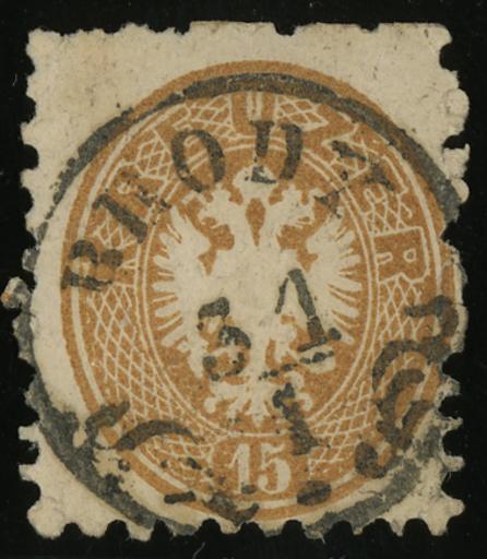 | Keywords: 1864 Brody 15k typRSb-f.jpg en Austria KK 15 kreuzer Stamp issue 1864 cancelled BRODY Galicia now in Ukraine Mueller typeRSb-f 2013-05-28 17 20 26 own Jacquesverlaeken Scanned object >100 years old cc-zero 1863 stamps of Austria Postmarks of Ukraine 1850-1919 Uploaded with UploadWizard History of Brody Postmarks of Lviv Oblast Animals on stamps to be categorised by country |
