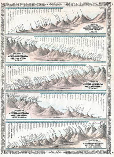 | Keywords: 1864 Johnson's World Mountains and Rivers Map or Chart - Geographicus - MtsRvrs-johnson-1864.jpg This is the 1864 edition of Johnson's Mountains and Rivers Chart This chart printed in 1864 represents a significant reimagining and re-engraving of Johnson's pre-1864 mountains and rivers charts Johnson first introduced a mountains and rivers chart in the second edition of his atlas published in 1861 That chart based on a related 1855 chart engraved by J H Colton was very similar to other topical charts common in European atlases of the period in that it presented all of the great mountains and rivers of the world in a single panoramic view Johnson perhaps recognizing that the traditional chart which necessarily highlighted the primacy of the great mountains and rivers of Asia was difficult to read with regard to the regions that interested his constituent readers - North Americans and Europeans Thus Johnson re-engraved his chart taking the bold step of dividing the world's great mountains and rivers by continent This curious move made the map more accessible on a continental level Johnson's 1864 mountains and rivers chart can also be read from a political perspective for by dividing the mountains according to continents each continent's mountains appear equally great While Johnson is not the first to focus his mountains and rivers chart on particular continent this is the first example we are aware of that consolidate the mountains and rivers all of the continents each represented individually on a single chart The chart is ordered roughly alphabetically in five sections with Africa at the top followed by Asia Europe South America and North America Curiously Johnson chooses to place North America below South America - a clear break his is alphabetical sequence This unusual move is possibly in deference to the perceived greater importance of North America relative to its southerly cousin In the Africa section Kilimanjaro is identified as the highest mountain and the Nile its longest river This chart also includes the Great Pyramid In the Asia second Everest at 29 000 feet is recognized as the highest mountain and the Yangtze as the longest river In the Europe section the highest mountain is Mont Blanc and the Volga is recognized as the longest River IN South America Tupungato Tupungata at 22 450 feet is identified as the highest mountain Aconcagua is a sad no 2 and the Amazon is the greatest River North America still not fully explored when this map was published lists Mt St Elias of the Canadian Yukon as the highest mountain followed by the Popocatepetl and Orizaba volcanoes of Mexico This is in fact somewhat reversed from actuality with Orizaba being the highest at 18 504 feet followed by Elias at 18 009 feet and Popocatepetl at 17 930 At this time neither Mount McKinley Denali nor Mount Logan the true highest peaks of North America had been measured Even so Johnson does correctly recognized the Mississippi as the continent's longest river Published by A J Johnson as plate nos 2-3 for issue in the 1864 edition of Johnson's Family Atlas Dated an copyrighted 1864 1864 dated Size in 17 25 23 25 object history credit line accession number MtsRvrs-johnson-1864 <i>Johnson's New Illustrated Steel Plate Family Atlas</i> 1864 edition Geographicus-source PD-old-100 Alvin Jewett Johnson Maps of mountains Old maps of rivers Geographic comparison diagrams Diagrams of Popocatépetl |