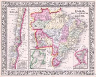 | Keywords: 1864 Mitchell Map of Brazil, Bolivia and Chili - Geographicus - SouthAmericaSouth-mitchell-1864.jpg A beautiful example of S A Mitchell Jr ™s 1864 two map sheet depicting parts of South America The left hand map depicts Chili with an inset of the Island of Juan Fernandez The right hand maps shows Brazil Bolivia Paraguay and Uruguay with insets of the Harbor of Bahia and the Harbor of Rio de Janeiro One of the most attractive American atlas maps of this region to appear in the mid 19th century Features the floral border typical of Mitchell maps from the 1860-65 period Prepared by S A Mitchell for inclusion as plate no 58 in the 1864 issue of Mitchell ™s New General Atlas Dated and copyrighted Entered according to Act of Congress in the Year 1860 by S Augustus Mitchell in the Clerk ™s Office of the District Court of the U S for the Eastern District of Pennsylvania 1860 dated Size in 13 5 11 object history credit line accession number SouthAmericaSouth-mitchell-1864 <i>Mitchell's New General Atlas containing Maps of the Various Countries of the World Plans of Cities Etc Embraced in Fifty-three Quarto Maps forming a series of Eighty-Four Map and Plans together with Valuable Statistical Tables </i> 1864 Edition Geographicus-source PD-old-100 Maps by Samuel Augustus Mitchell 1864 maps Brazil in the 1860s Old maps of Brazil Old maps of Bolivia Old maps of Chile Old maps of Paraguay Old maps of Uruguay Maps of Empire of Brazil |