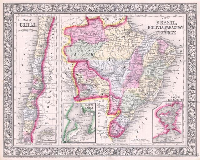 | Keywords: 1864 Mitchell Map of Brazil, Bolivia and Chili - Geographicus - SouthAmericaSouth-mitchell-1864.jpg  A beautiful example of S A Mitchell Jr ™s 1864 two map sheet depicting parts of South America The left hand map depicts Chili with an inset of the Island of Juan Fernandez The right hand maps shows Brazil Bolivia Paraguay and Uruguay with insets of the Harbor of Bahia and the Harbor of Rio de Janeiro One of the most attractive American atlas maps of this region to appear in the mid 19th century Features the floral border typical of Mitchell maps from the 1860-65 period Prepared by S A Mitchell for inclusion as plate no 58 in the 1864 issue of Mitchell ™s New General Atlas Dated and copyrighted Entered according to Act of Congress in the Year 1860 by S Augustus Mitchell in the Clerk ™s Office of the District Court of the U S for the Eastern District of Pennsylvania 1860 dated Size in 13 5 11 object history credit line accession number SouthAmericaSouth-mitchell-1864 <i>Mitchell's New General Atlas containing Maps of the Various Countries of the World Plans of Cities Etc Embraced in Fifty-three Quarto Maps forming a series of Eighty-Four Map and Plans together with Valuable Statistical Tables </i> 1864 Edition Geographicus-source PD-old-100 Maps by Samuel Augustus Mitchell 1864 maps Brazil in the 1860s Old maps of Brazil Old maps of Bolivia Old maps of Chile Old maps of Paraguay Old maps of Uruguay Maps of Empire of Brazil |