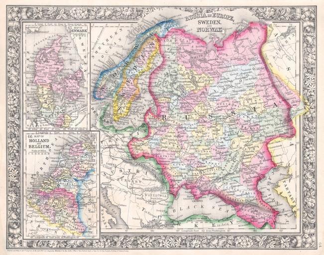| Keywords: 1864 Mitchell Map of Russia, Scandinavia, Denmark, Holland and Belgium - Geographicus - Russia-mitchell-1864.jpg A beautiful example of S A Mitchell Jr ™s 1864 map of Russia Norway Sweden Holland Belgium and Denmark Maps of Denmark Holland and Belgium relegated in insets on the left hand side of the map Denotes both political and geographical details Extends as far south and west as the boot of Italy and as far east as the Caspian Sea and the Gulf of Obi One of the most attractive American atlas maps of this region to appear in the mid 19th century Features the floral border typical of Mitchell maps from the 1860-65 period Prepared by S A Mitchell for inclusion as plate no 64 in the 1864 issue of Mitchell ™s New General Atlas Dated and copyrighted Entered according to Act of Congress in the Year 1860 by S Augustus Mitchell in the Clerk ™s Office of the District Court of the U S for the Eastern District of Pennsylvania 1860 dated Size in 13 75 11 object history credit line accession number Russia-mitchell-1864 <i>Mitchell's New General Atlas containing Maps of the Various Countries of the World Plans of Cities Etc Embraced in Fifty-three Quarto Maps forming a series of Eighty-Four Map and Plans together with Valuable Statistical Tables </i> 1864 Edition Geographicus-source PD-old-100 Maps by Samuel Augustus Mitchell Old maps of the Russian Empire Old maps of Scandinavia Old maps of Denmark Old maps of the Netherlands Old maps of Belgium 1860 maps |