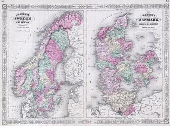 | Keywords: 1865 Johnson Map of Sweden, Norway and Denmark - Geographicus - SwedenDenmark-j-65.jpg This is a magnificent 1865 hand colored map Scandinavia is divided into two parts The left map represents Norway and Sweden The right map depicts Denmark as well as the provinces of Sleswick Holstein Depicts the area in considerable detail including both political and physical geographic features Map is dated and copyrighted Entered according to Act of Congress in the Year of 1865 by A J Johnson in the Clerk ™s Office of the District Court of the United States for the Southern District of New York 1865 Size in 24 17 object history credit line accession number SwedenDenmark-j-65 Geographicus-source PD-old-100 Maps by Alvin Jewett Johnson 1865 maps Old maps of Denmark Old maps of Norway Old maps of Sweden |