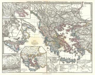 | Keywords: 1865 Spruner Map of Greece, Macedonia and Thrace before the Peloponnesian War. - Geographicus - GraeciaMacedoniaThracia-spruner-1865.jpg This is Karl von Spruner ™s 1865 map of Graecia Macedonia Thracia Showing the whole of Greece Macedonia and Thracia modern day Southeast Bulgaria Northeast Greece and European Turkey the map also includes 6 smaller insets Counter-clockwise the insets include Macedonia Marathon Plataea Graecia Mantinea and Leuctra The insets of Mantinea and Leuctra depict the important battles that took place at these locations during the Peloponnesian War and the Post-Corinthian War conflict respectively Countries and territories are outlined in color The whole is rendered in finely engraved detail exhibiting throughout the fine craftsmanship of the Perthes firm 1865 undated Size in 16 13 object history credit line accession number GraeciaMacedoniaThracia-spruner-1865 Spruner Karl von <i>Spruner-Menke Atlas Antiquus </i> Gotha Justus Perthes 1865 Geographicus-source PD-old-100 Karl Spruner von Merz Maps of the Peloponnesian War Maps of Magna Graecia Maps of ancient Sicily Maps of Mantineia |