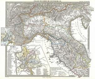 | Keywords: 1865 Spruner Map of Northern Italy in Antiquity - Geographicus - ItaliaeIIII-spruner-1865.jpg A particularly interesting map this is Karl von Spruner ™s 1865 rendering of Northern Italy and Rome in antiquity This map covers northern Italy from modern day Venetia south as far as Rome and west to modern day Piedmont Like most of Spruner ™s work this example overlays ancient political geographies on relatively contemporary physical geographies thus identifying the sites of forgotten towns and villages the movements of armies and the disposition of lands in the region This particular example includes ancient names for many important regions and sites Additionally two inset maps are offered in the lower left quadrant The larger of the two insets is a city plan of Rome including the ancient city walls and an elaborate key identifying some 62 historic sites The smaller of the two insets details the Palace of Octavius Region Urbis Octava As a whole the map labels important cities rivers mountain ranges and other minor topographical detail Territories and countries outlined in color The whole is rendered in finely engraved detail exhibiting the fine craftsmanship for which the Perthes firm is known 1865 undated Size in 16 13 object history credit line accession number ItaliaeIIII-spruner-1865 Spruner Karl von <i>Spruner-Menke Atlas Antiquus </i> Gotha Justus Perthes 1865 Geographicus-source PD-old-100 Karl Spruner von Merz Old maps of Italy Maps of ancient Italy Old maps of ancient Rome city 1865 |