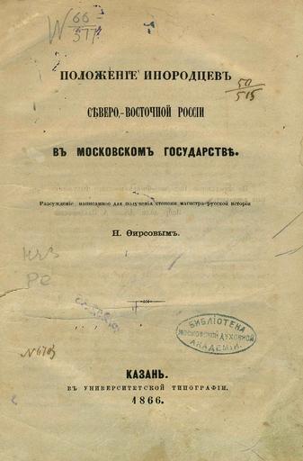 Положение инородцев Северо-Восточной России в Московском государстве / рассуждение, написанное для получения степени магистра русской истории Н. Фирсовым. - Казань : Университетская тип., 1866. - 261, IV, [3] с.; 23 см.